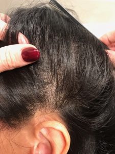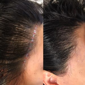 A second picture of the same person, view from the other side where there is one long scar tucked neatly inside the hairline. The white line represents how close the micro-dots were brought towards the hairline, looking very natural. We have one more visit where we’ll be closing in the hairline however; the scar has been successfully hidden. At this point the amount deposited would suffice, yet being a little OCD, I have need to touch up just a… little bit more.